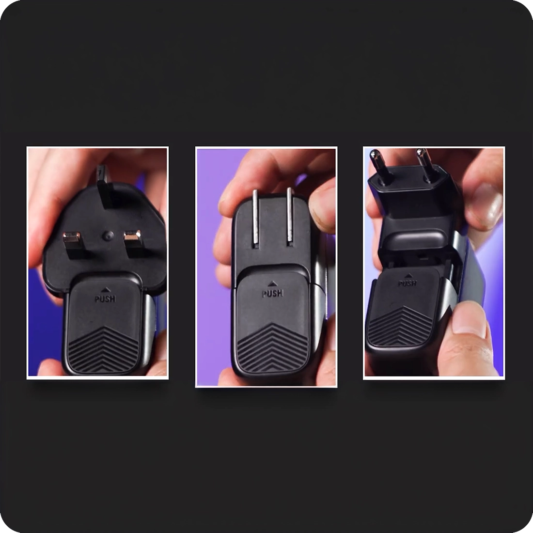 Um Ihnen die größtmögliche Vielseitigkeit zu garantieren, ist das Ladegerät SR101 ausgestattet mit 3 auswechselbaren Spitzen. Der Eingang steht Ihnen zur Verfügung europäisch,uK i amerikanisch. So können Sie Ihre Geräte aufladen, wo immer Sie sind. Sie können das Ladegerät problemlos mit in den Urlaub nehmen. Sie müssen sich nicht darum kümmern, welche Steckdosen Sie vor Ort vorfinden.