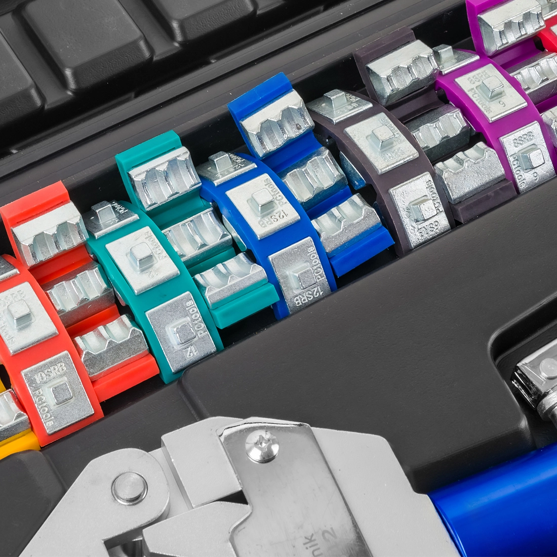 Die hydraulische Crimppresse SP-PP01 von Spacetronik ist mit einer Reihe von austauschbaren Matrizen ausgestattet, mit denen Sie Schläuche mit unterschiedlichen Durchmessern präzise verpressen können. Dadurch ist das Werkzeug äußerst flexibel und kann für eine Vielzahl von Installations- und Industriearbeiten eingesetzt werden. Egal, ob Sie mit dicken oder dünnen Schläuchen arbeiten, die austauschbaren Matrizen gewährleisten eine perfekte Passform und eine präzise Verpressung: