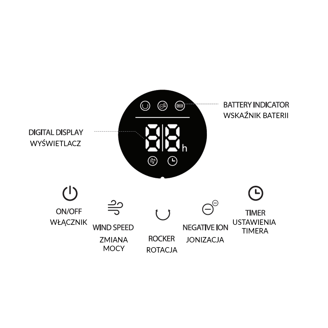 Sie liegen gemütlich im Bett und möchten den Ventilator einschalten, um sich ein wenig abzukühlen? Der steht aber am anderen Ende des Raumes und Sie wollen nicht aufstehen? Speziell für solche Fälle wurde dem Spacetronik AirPuff 2 Ventilator eine multifunktionale Fernbedienung beigelegt. Mit ihr können Sie den Ventilator nicht nur ein- und ausschalten. Sie können auch die Rotation starten und stoppen, die Geschwindigkeit reduzieren und erhöhen, die Timerfunktion oder die Ionisierung einstellen. Sie können alle Funktionen Ihres Ventilators steuern, ohne das Bett verlassen zu müssen. Was aber, wenn die Batterien in Ihrer Fernbedienung leer sind und Sie keine zu Hause haben, um sie zu wechseln? In diesem Fall können Sie den Ventilator mühelos über die Tasten an der Basis des Ventilators steuern.