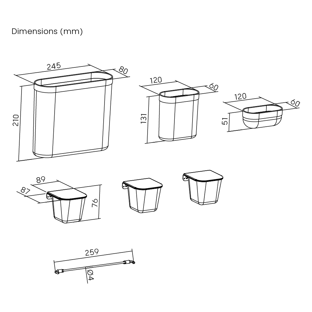 1x koszyk duży, 1x koszyk średni, 1x koszyk mały, 3x pojemnik, 1x elastyczny uchwyt