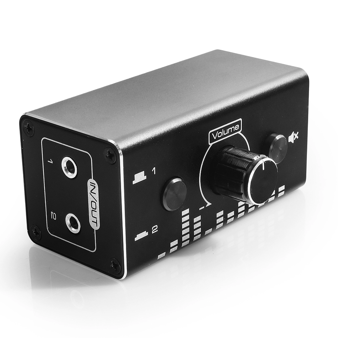Der Zwei-Wege-Stereo-Audioschalter ermöglicht es Ihnen, zwei verschiedene Audiogeräte (z. B. ein Gerät zur Musikwiedergabe) an einen Satz aktiver Lautsprecher oder Kopfhörer anzuschließen und dann zu wählen, welches dieser Geräte zu einem bestimmten Zeitpunkt Audio an die Lautsprecher oder Kopfhörer sendet.