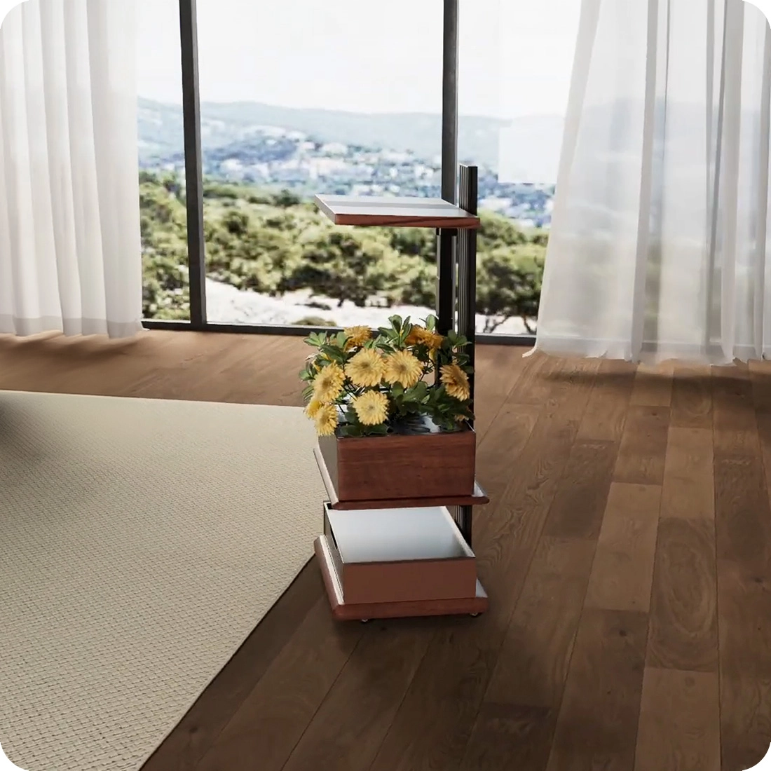 So können Sie den Blumenständer in jedem Raum Ihrer Wohnung aufstellen. Ohne sich Sorgen zu machen, dass er die Ästhetik Ihrer Wohnung beeinträchtigt.