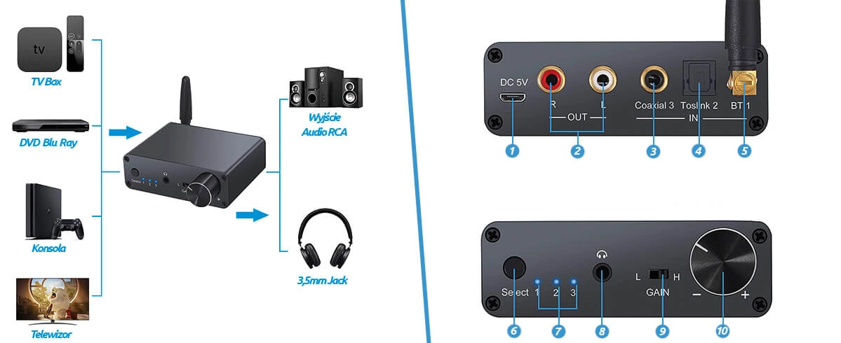 1. Konvertiert koaxiale, Toslink- und Bluetooth-Signale in analoge L/R- und 3,5-mm-Klinken-Audiosignale
