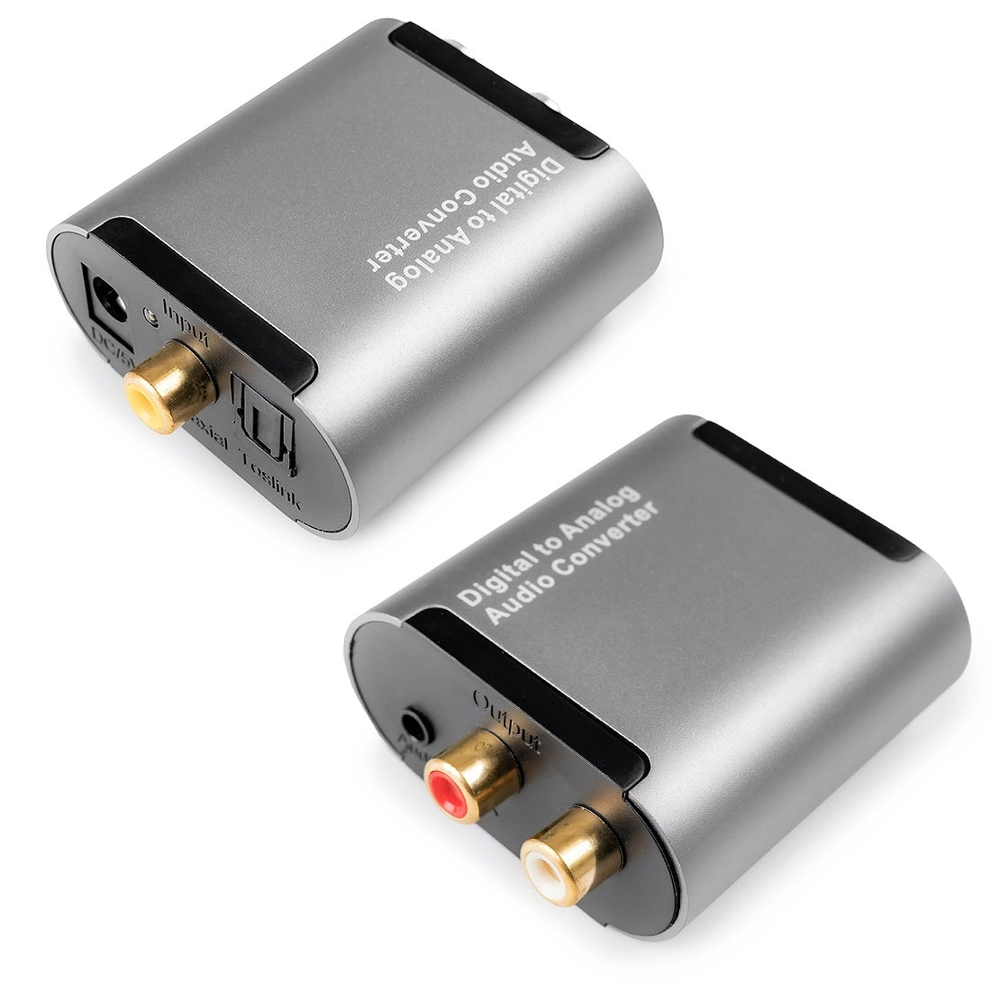- Konvertiert digitales Koaxial- oder Toslink-Audio in analoges L/R-Audio.