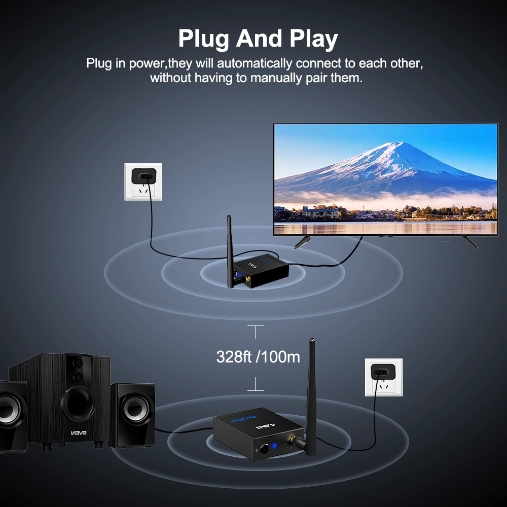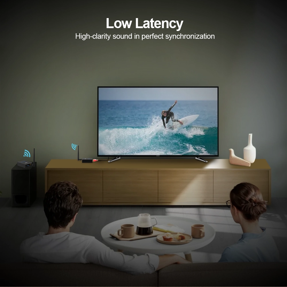 HiFi Audio und 2.4GHz latenzfrei RT5066 Wireless TV Sender und Empfänger unterstützen 2.4GHz, die Latenz ist weniger als 20ms, so dass Sie mit besserem Timing fernsehen können. Er kann Audio in hoher Qualität mit bis zu 24bit / 192 kHz übertragen, besser als CD-Qualität.