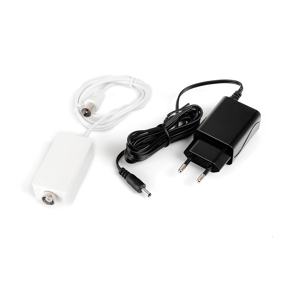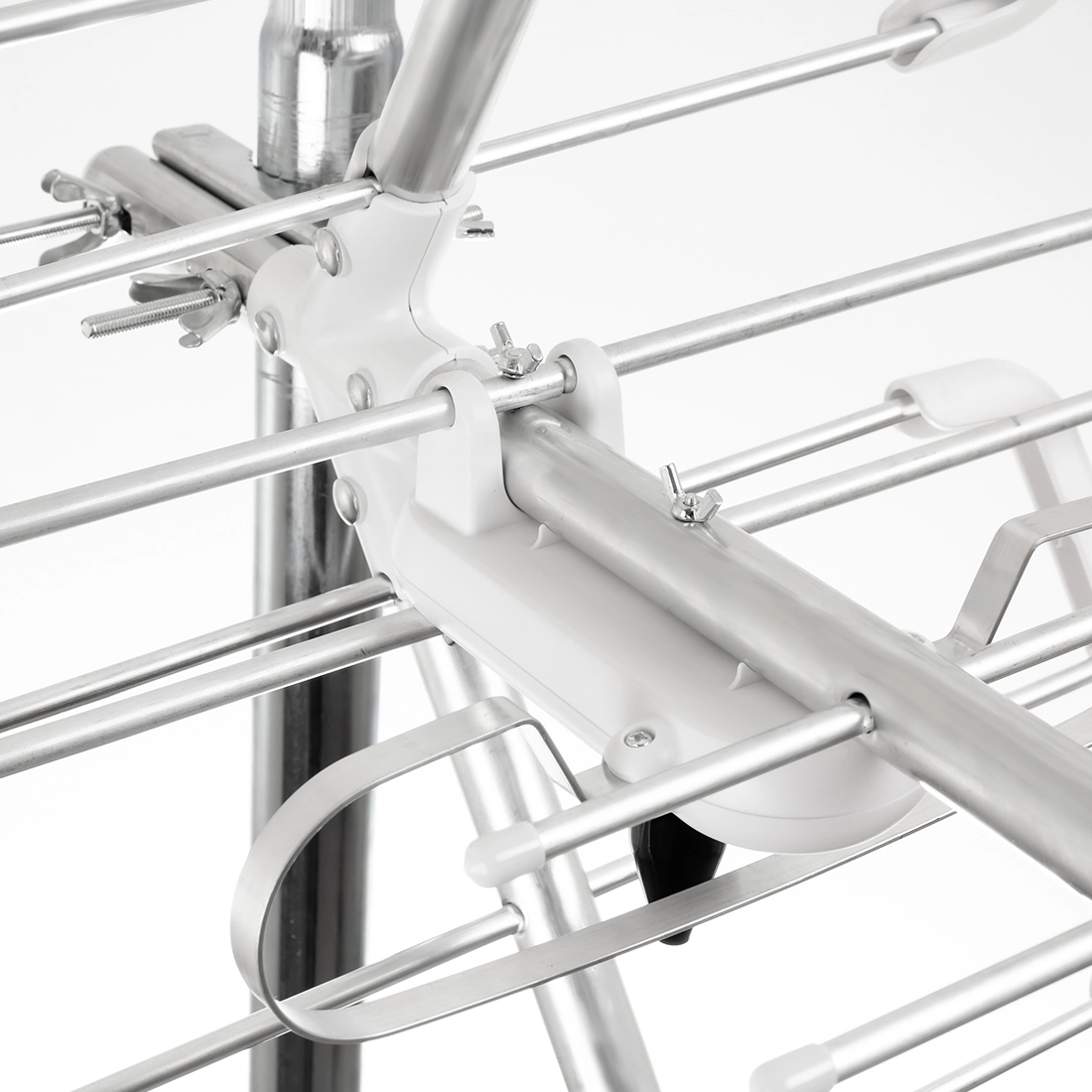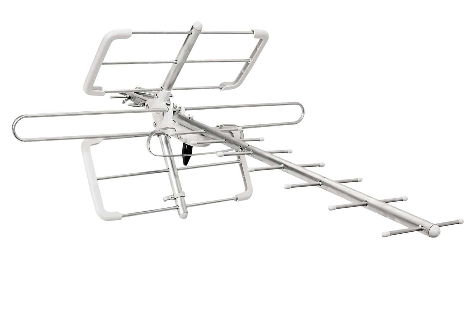 SPEZIFIKATION: Material: Hochwertige, wetterbeständige und korrosionsbeständige Elemente, Empfangsbereich: VHF+UHF (Combo), Kanäle: 5-12 + 21-59, Frequenz [MHz]: 174-230 + 470-698, Ausgangsimpedanz [Ohm]: 75, Polarisation: horizontal, Anschluss: Typ F, LTE-Filter: Ja, integriert, Maximaler Montagedurchmesser: 60mm, Abmessungen [mm]: 975x740x430, Farbe: weiß, Empfang: UHF, VHF; Digitales Radio DAB+; Anzahl der Polarisationen: 1 - horizontal oder vertikal, Ungefähre Reichweite (Aufteilung nach Gewinn dBi): 100 Km, LTE-Filter: ja; Antennentyp: aktiv, Verlängerungskabel im Set