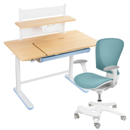 • Höhenverstellbarer Schreibtisch für Kinder. Höhenverstellung von 55 bis 89 cm und Neigungsverstellung 0-40 Grad. Tischplatte 60 x 112 cm. In Weiß und Blau. Wird mit einer Schreibtischablage SPB-116T geliefert.