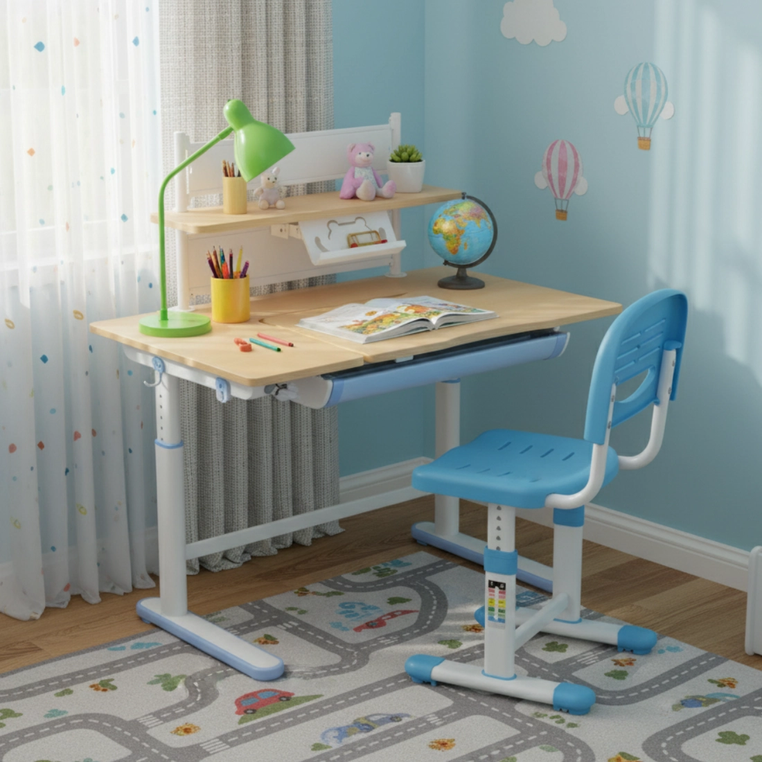Ein Schreibtisch kann von vielen Kindern genutzt werden. Sie müssen nur die Höhe für jedes einzelne Kind einstellen