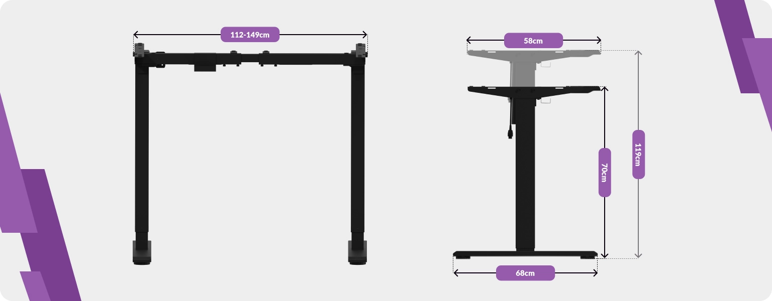 Dank der Verwendung von 2 Hubsegmenten ist das Gestell stabil und ermöglicht es, den Schreibtisch auf eine Höhe von 119 cm zu bringen. So können Sie sowohl im Stehen als auch im Sitzen bequem arbeiten. Das Gestell hat die Form einer rechteckigen Säule, die sich in jede, auch moderne, Einrichtung einfügen lässt. Der Fuß ist ebenfalls elegant und verfügt über verstellbare Füße, mit denen Sie Unebenheiten im Boden ausgleichen können.