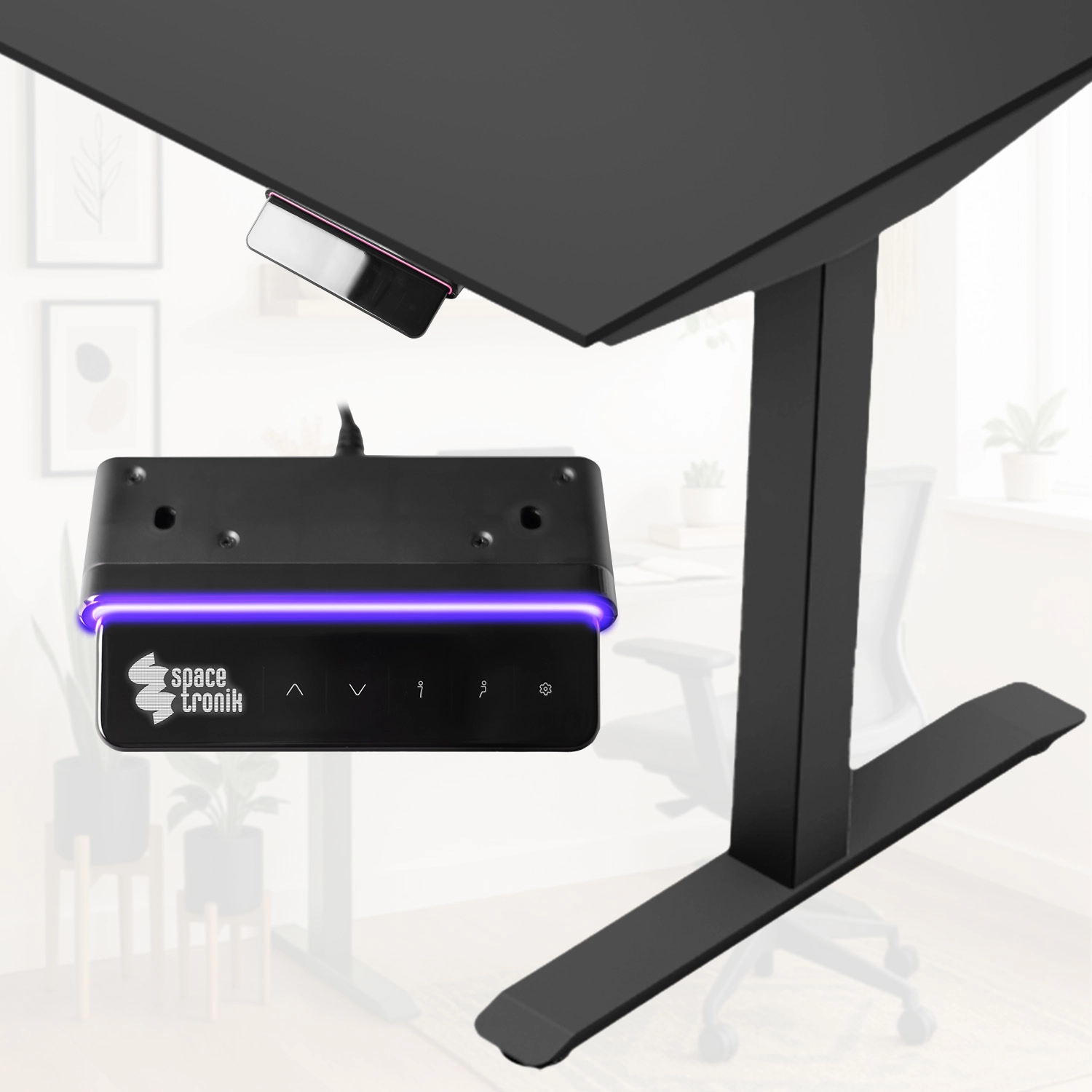 Stelaż elektrycznie regulowany Spacetronik SPE-222OB został wyposażony w kontroler z udogodnieniami. Dokonuj zmian, zapisuj ustawienia na czytelnym wyświetlaczu OLED. Reguluj wysokość za pomocą przycisków "góra" oraz "dół" i obserwuj aktualną pozycję na ekranie OLED. Biurko umożliwia blokadę kontrolera np. przed niepożądanym użyciem przez dzieci. Przestrzeń wokół przycisków jest podświetlania kilkoma kolorami naprzemiennie lub do wyboru spośród 7 kolorów.