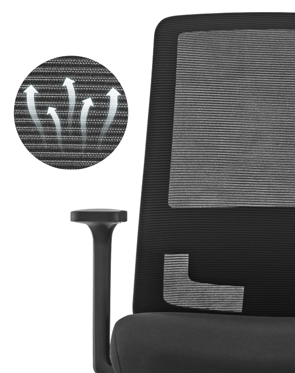 Die Rückenlehne und die Kopfstütze sind aus atmungsaktivem Netzgewebe gefertigt, das die Luftzirkulation ermöglicht.