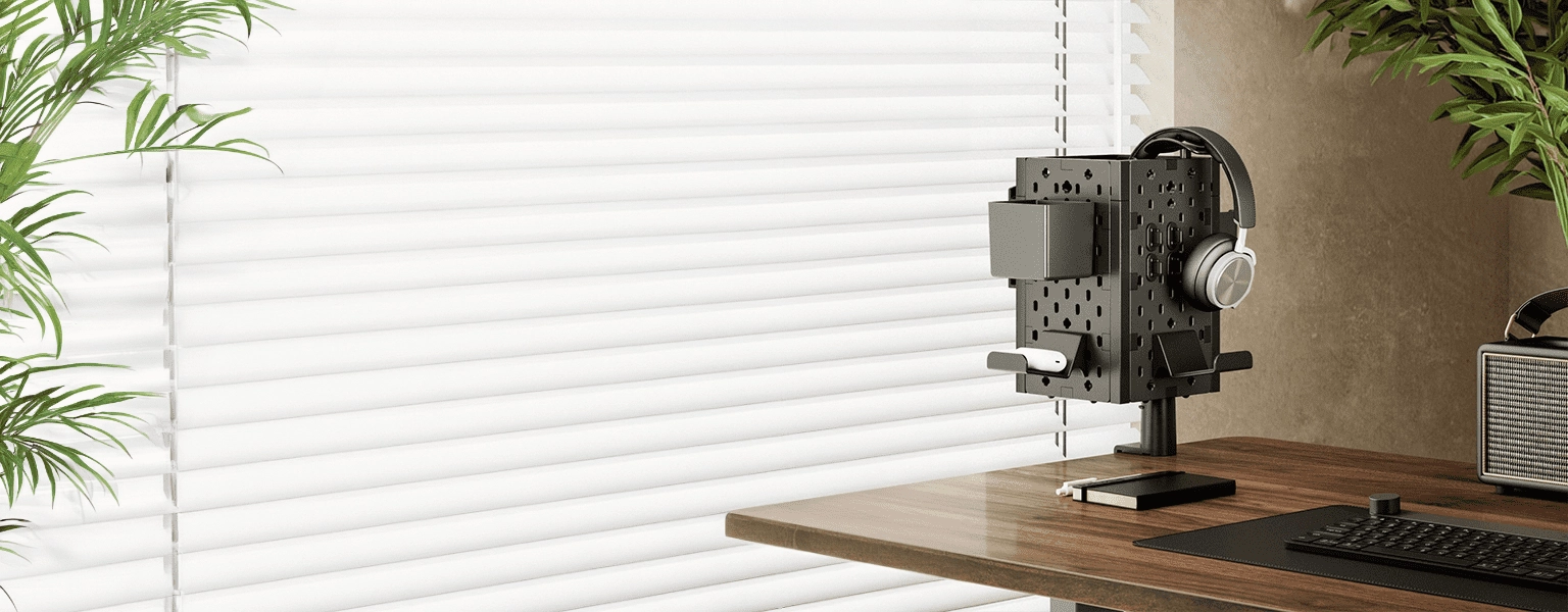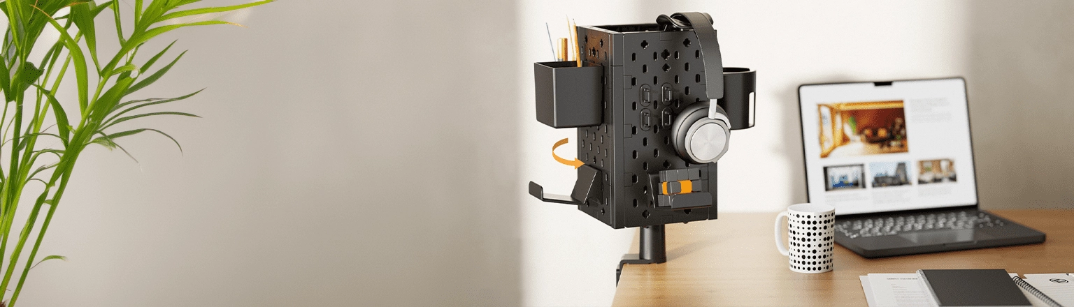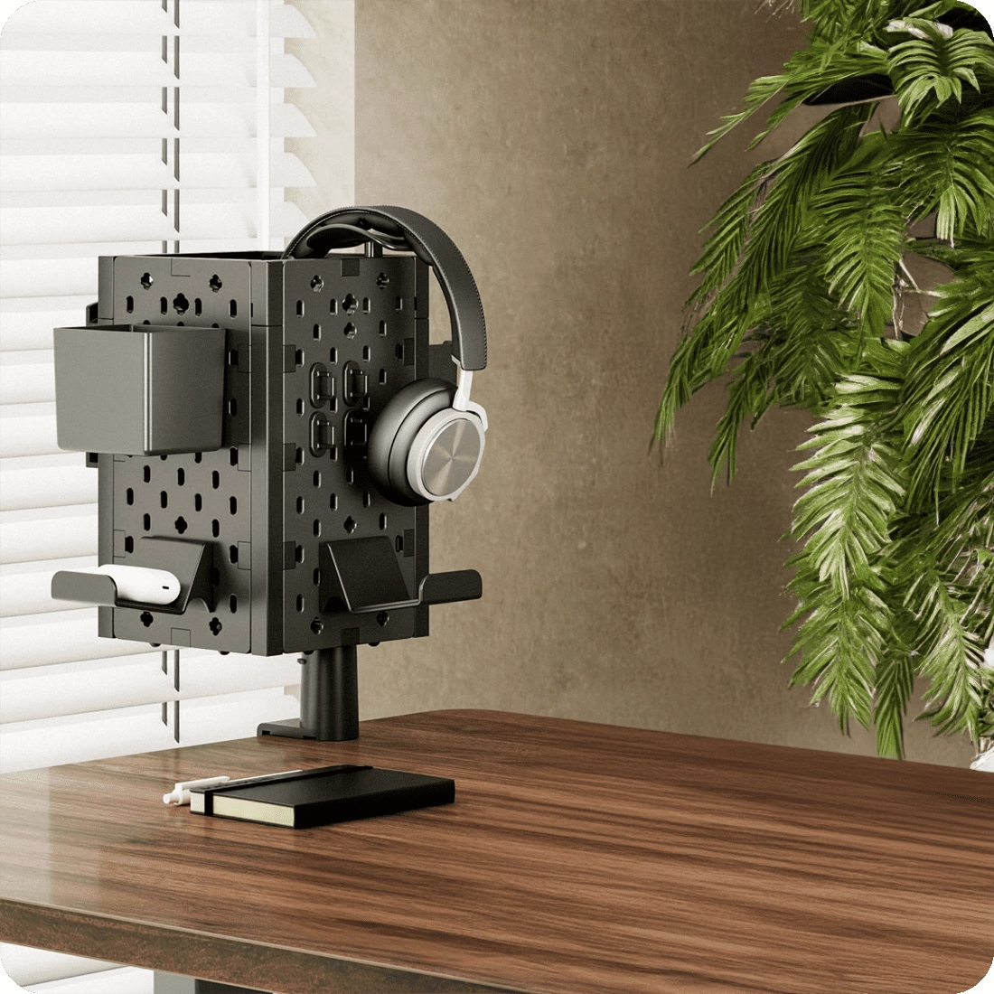 Zusätzlich zu den 4 modularen perforierten Teilen enthält das Set Schreibwarenhalter, Becherhalter, Blockhalter, zwei Arten von Kopfhörerhaltern und Kabelhalter. Es handelt sich um einen kompletten Schreibtischhalter, mit dem Sie Ihr Schreibtischzubehör leicht organisieren können. Sie können selbst entscheiden, wo Sie die einzelnen Halterungen anbringen und wie Sie sie verwenden möchten.
