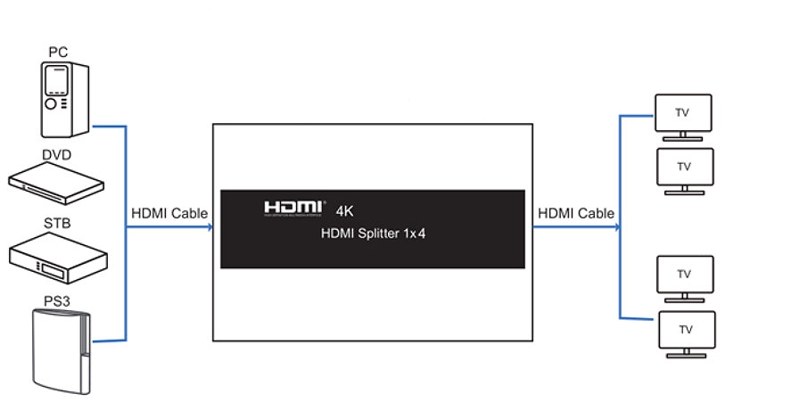- Ein HDMI-Eingangssignal wird auf 4 HDMI-Geräte aufgeteilt