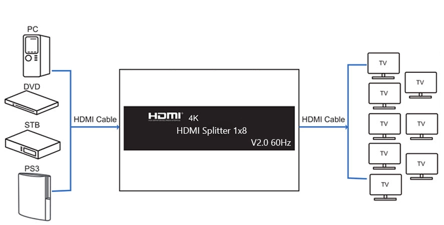 - Aufteilung eines HDMI-Eingangssignals auf acht HDMI-Geräte