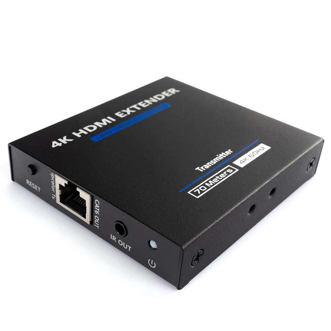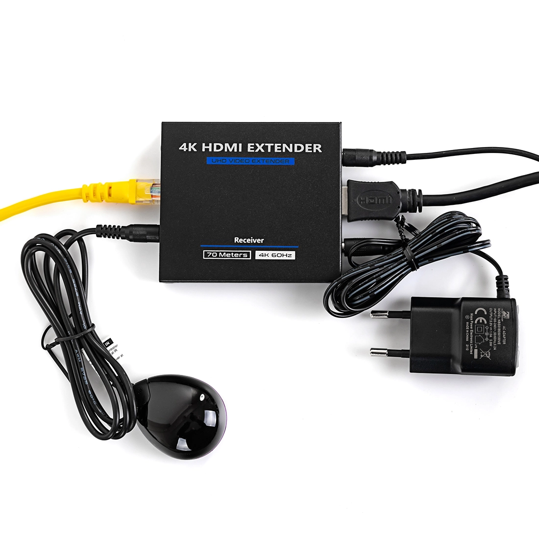 Der HDMI Extender ermöglicht die Übertragung und Verlängerung eines unkomprimierten HDMI UHD 4K @ 60Hz Signals über CAT6 / 6A / 7 Netzwerkkabel, die Übertragungsdistanz beträgt bis zu 70 Meter bei 4K Auflösung mit null Latenz. Das Kit enthält eine Sendeeinheit (TX) und eine Empfängereinheit (RX), die als Paar arbeiten. Die Einheit verfügt über bidirektionale IR-Unterstützungsfunktionen.