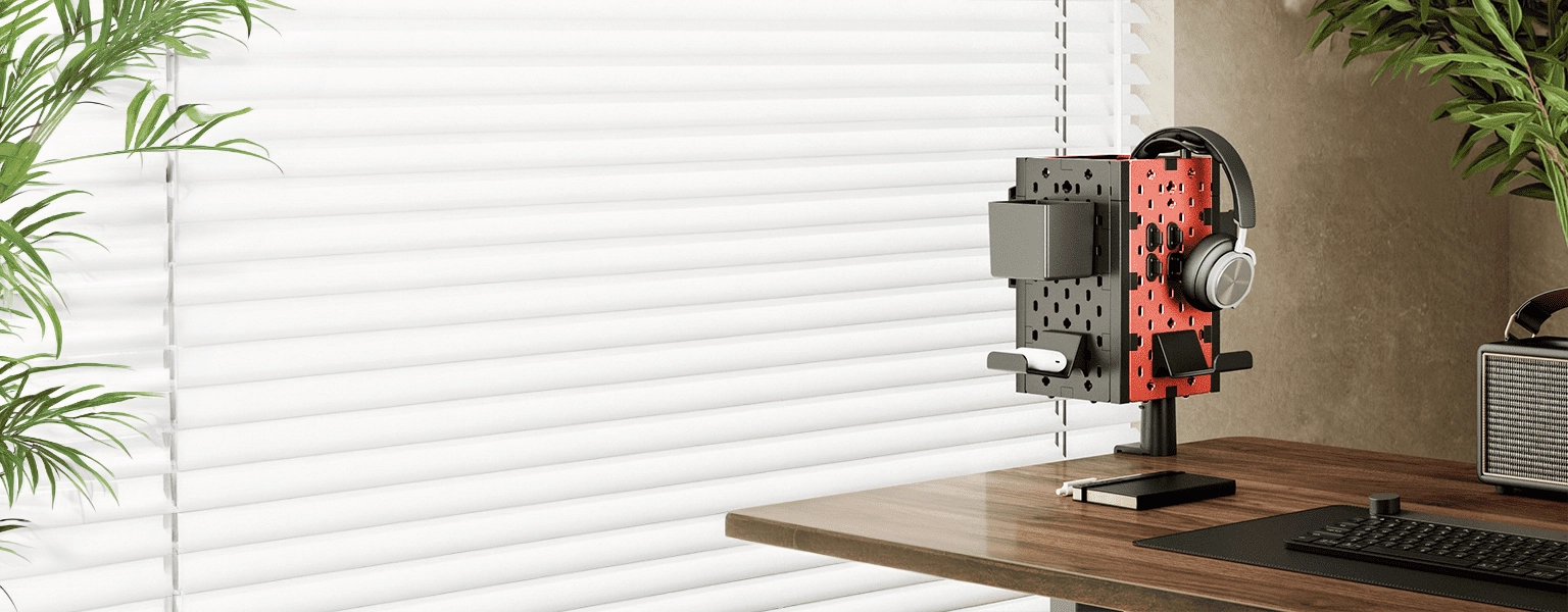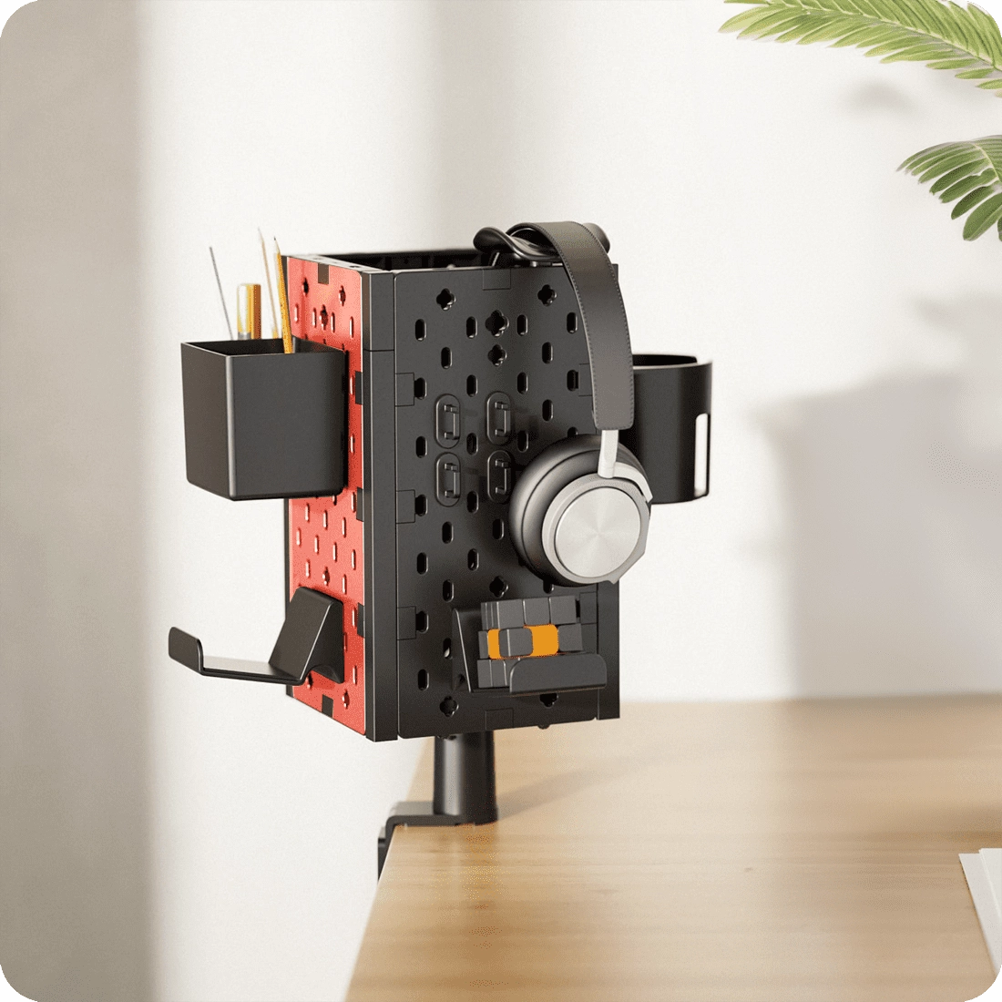Zusätzlich zu den 4 modularen perforierten Teilen enthält das Set Schreibwarenhalter, Becherhalter, Blockhalter, zwei Arten von Kopfhörerhaltern und Kabelhalter. Es handelt sich um einen kompletten Schreibtischhalter, mit dem Sie Ihr Schreibtischzubehör leicht organisieren können. Wo Sie die einzelnen Halterungen anbringen und wie Sie sie verwenden, bleibt Ihnen überlassen.