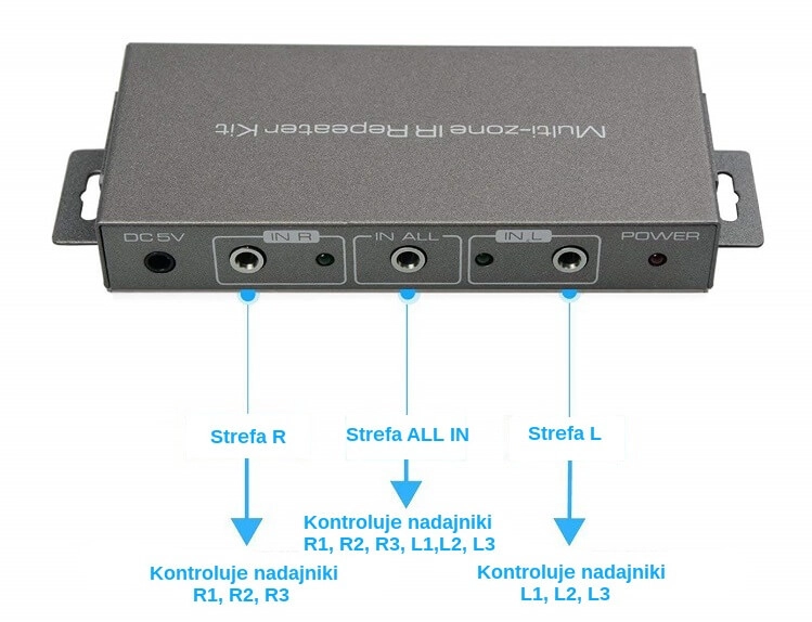 Die IR-Sender können in 3 verschiedene Räume (Zonen) aufgeteilt werden, von denen einer alle IR-Sender bedienen kann (sowohl links als auch rechts), und zwei, die je nach Seite arbeiten können. (Eine Zone bedient L1, L2, L3, die andere Zone bedient R1, R2, R3).