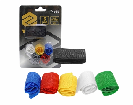 Band zum Bündeln und Ordnen von Kabeln am Arbeitsplatz. Starke und dauerhafte Befestigung dank des "RZEP"-Verschlusssystems. Band in sechs Farben (schwarz, rot, blau, grün, gelb, weiß) zur einfachen Trennung und Auswahl. Länge des Bandes 165 mm