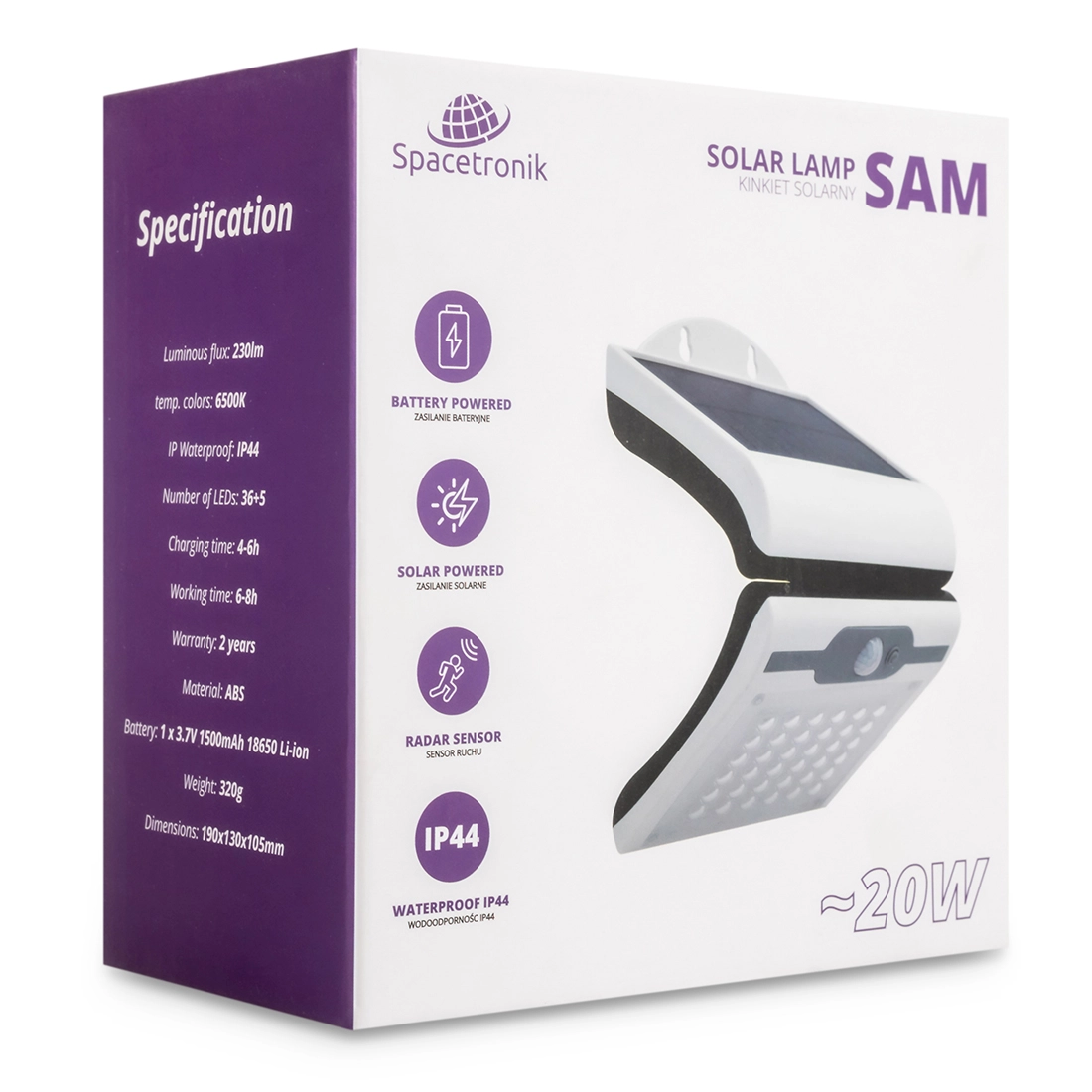 • Outdoor verstellbare LED-Wandleuchte 20W Spacetronik SAM. Macht Licht in der Anlage kabellos, wartungsfrei und kostenneutral. Diese wird durch einen eingebauten Dämmerungs- und Bewegungssensor überwacht. Wiederaufladbare Batterie aus einem Solarpanel.