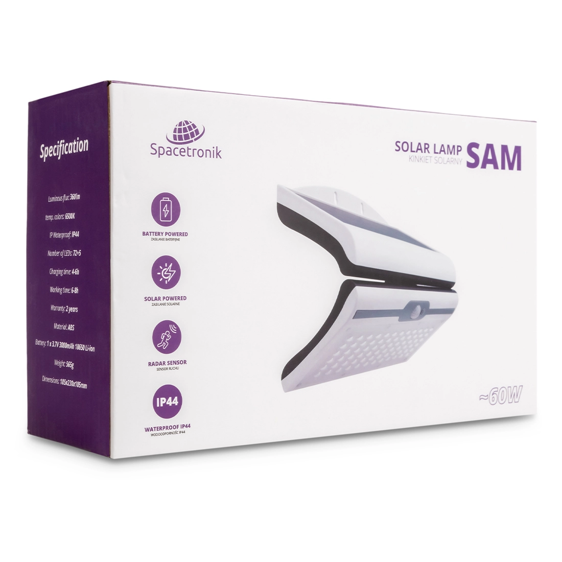 • Outdoor verstellbare LED-Wandleuchte 60W Spacetronik SAM. Macht Licht in der Anlage kabellos, wartungsfrei und kostenneutral. Diese wird durch einen eingebauten Dämmerungs- und Bewegungssensor überwacht. Wiederaufladbare Batterie durch ein Solarpanel.