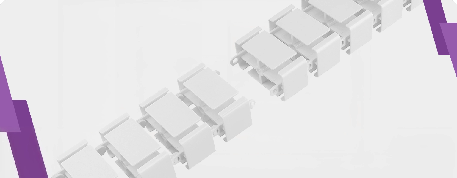 Die einrastbaren Blöcke lassen sich miteinander verbinden und ergeben eine Gesamtlänge von 130 cm. Die Kabelführung ist auf einer Seite mit einem Befestigungselement auf einer Seite (Schrauben erforderlich - nicht im Lieferumfang enthalten) und einem Fuß, der auf dem Boden aufliegt. Die Wirbelsäule kann durch Hinzufügen/Entfernen von Blöcken beliebig durch Hinzufügen/Entfernen von Blöcken. eines einzelnen Blocks beträgt 68 x 36 mm. Das Kabelgitter ist mit vier Tunneln versehen, die eine beliebige Aufteilung der Kabel ermöglichen. Platzierung Die Kabeleinführung ist sehr einfach - einfach einen Flügel des Blocks leicht umbiegen und platzieren Sie das Kabel darin.