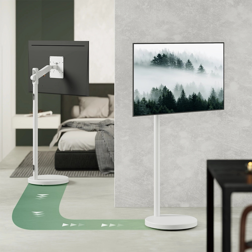 Mobilny stojak SPE-T02W posiada ukryte w podstawie kółka, które nie rzucają się w oczy, a jednocześnie pozwalają na płynne i szybkie przemieszczanie urządzenia. Mobilna podstawa z ukrytymi kółkami to połączenie estetyki i funkcjonalności, które sprawdzi się w każdej przestrzeni – od biura po studio nagraniowe czy przestrzeń wystawową. Przenoszenie monitora z miejsca na miejsce jeszcze nigdy nie było tak proste i dyskretne.