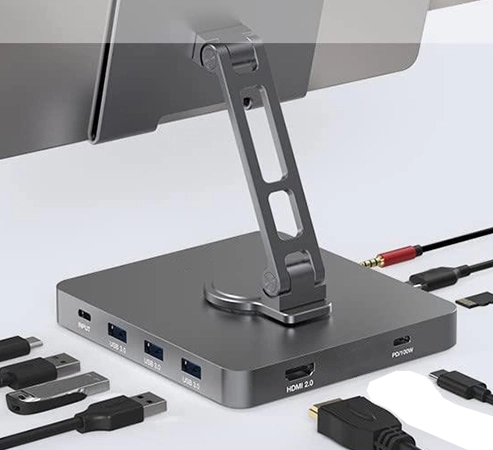 Der Laptop-Ständer mit USB-C, USB, HDMI, Kartenleser und AUX ist ein praktisches Zubehör, mit dem Sie Ihr Telefon bequemer und funktionaler nutzen können. Es ist eine Art Dockingstation oder Ständer, der auf einem Schreibtisch, Tisch oder überall dort platziert werden kann, wo Sie seine Konnektivität auf verschiedene Geräte erweitern möchten.