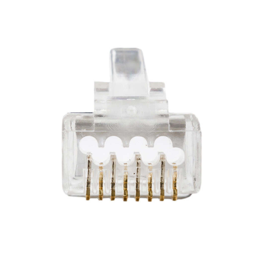 Dieser innovative achtpolige RJ45-Stecker mit Pass-Through-System vereinfacht den Anschluss, da alle Adern vollständig durch den Stecker gezogen werden können. Er wird für den Anschluss von Twisted-Pair-Kabeln in ICT- und Computerinstallationen verwendet. Dank der Durchschleifung werden die Drähte gleichmäßig ausgerichtet und der Installateur kann die korrekte Reihenfolge der Platzierung vor dem Crimpen leichter kontrollieren. Beim Verpressen werden überstehende Drähte abgeschnitten. Für Durchgangsstecker und deren ordnungsgemäße Vercrimpung ist ein spezielles Crimpwerkzeug erforderlich. RJ45-Durchgangsstecker garantieren eine viel bessere und präzisere Vercrimpung als Standardstecker.