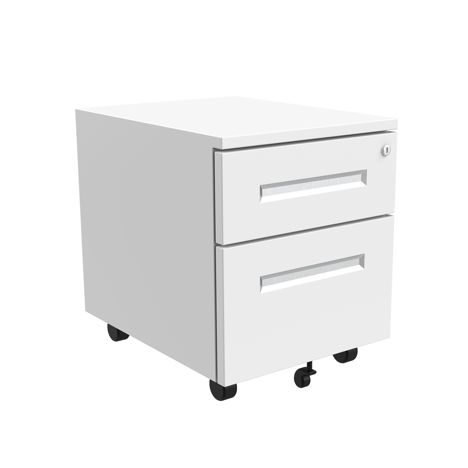 Ein aufgeräumter, gut organisierter Platz im Büro ist ein absolutes Muss. Der mobile Untertischcontainer ist die ideale Lösung für die Aufbewahrung von Unterlagen und Büromaterial. Alles, was Sie brauchen, ist in greifbarer Nähe. Er ist sowohl für das Heimbüro als auch für das Büro geeignet. Der Schrank ist aus hochwertigem, pulverbeschichtetem Stahl gefertigt, was für eine außergewöhnliche Festigkeit und Stabilität sorgt - eine Lösung für viele Jahre. Durch das schlichte, moderne Design fügt sich der Schrank perfekt in jedes Interieur ein. Das zentrale Schließsystem garantiert Sicherheit. In einer der beiden geschlossenen Schubladen können Dokumente und Wertsachen aufbewahrt werden. Dank der integrierten Rollen lässt er sich leicht bewegen. Der Schrank ist fast einsatzbereit, Sie müssen nur noch die Rollen montieren (Sie benötigen dafür kein Werkzeug).