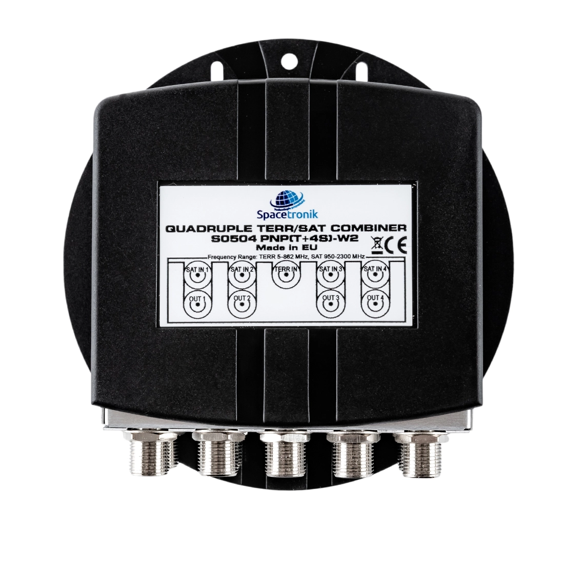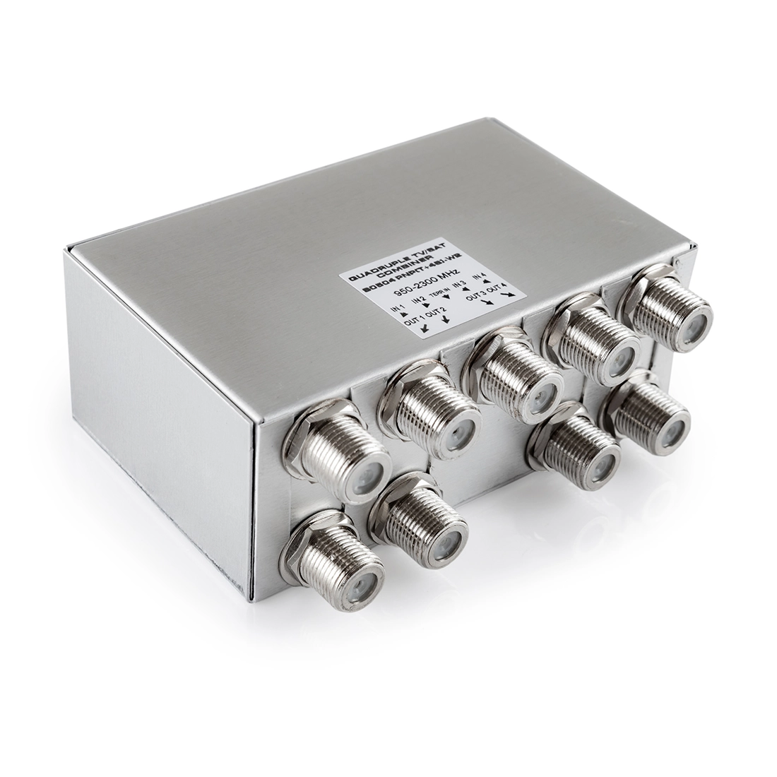 Satellitensignalkombinierer aus einem LNB-Quad-Konverter (LNB-Monoblock-Quad) mit DVB-T/DVB-T2-Signalen