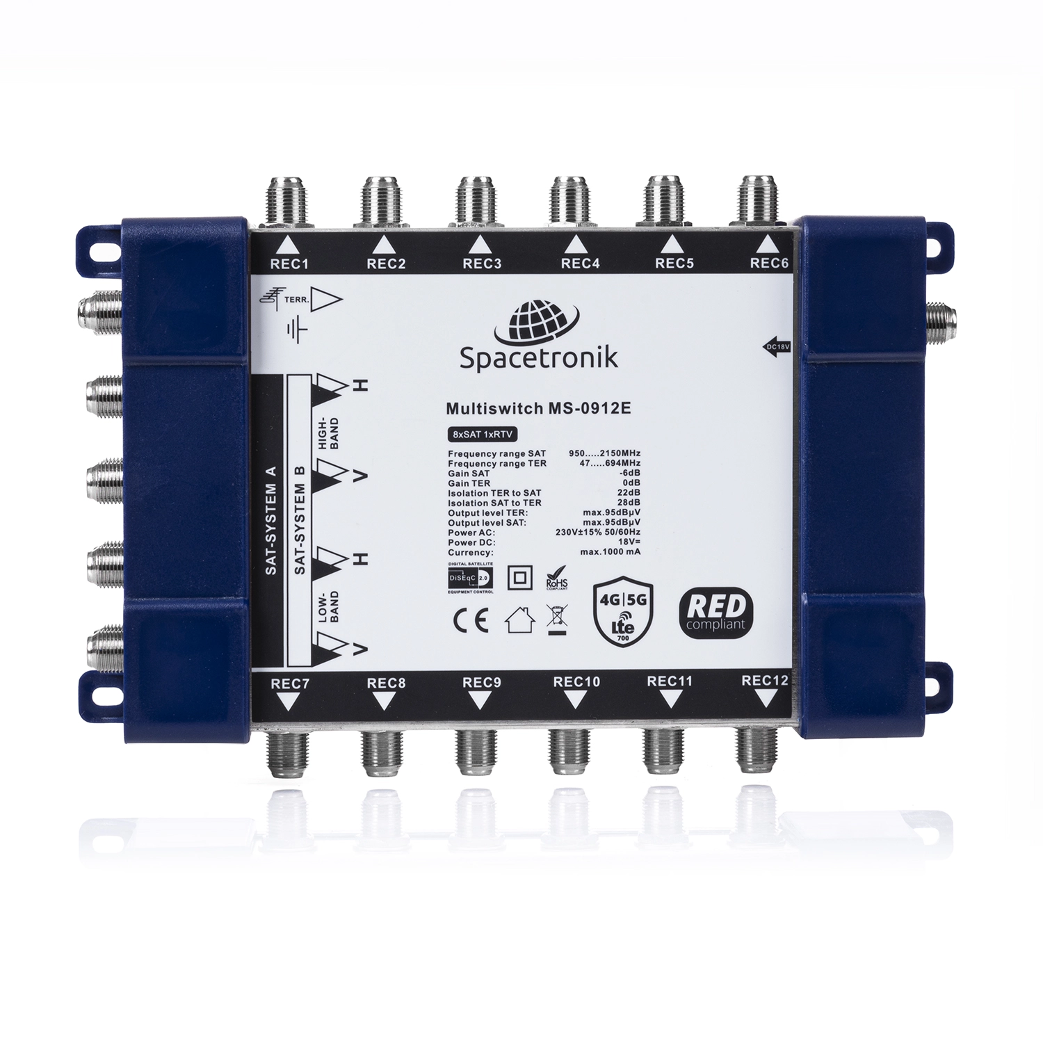Der Multischalter ist für die Erweiterung von Innenantennenanlagen von DVB-S2-Satelliten- und DVB-T/T2-Terrestrik-TV-Anlagen konzipiert. Das Gerät ermöglicht die Verteilung von Satelliten- und terrestrischen Signalen und den Anschluss von bis zu 12 RTV-SAT-Dosen, Satellitenreceivern, DVB-T-Receivern, etc...