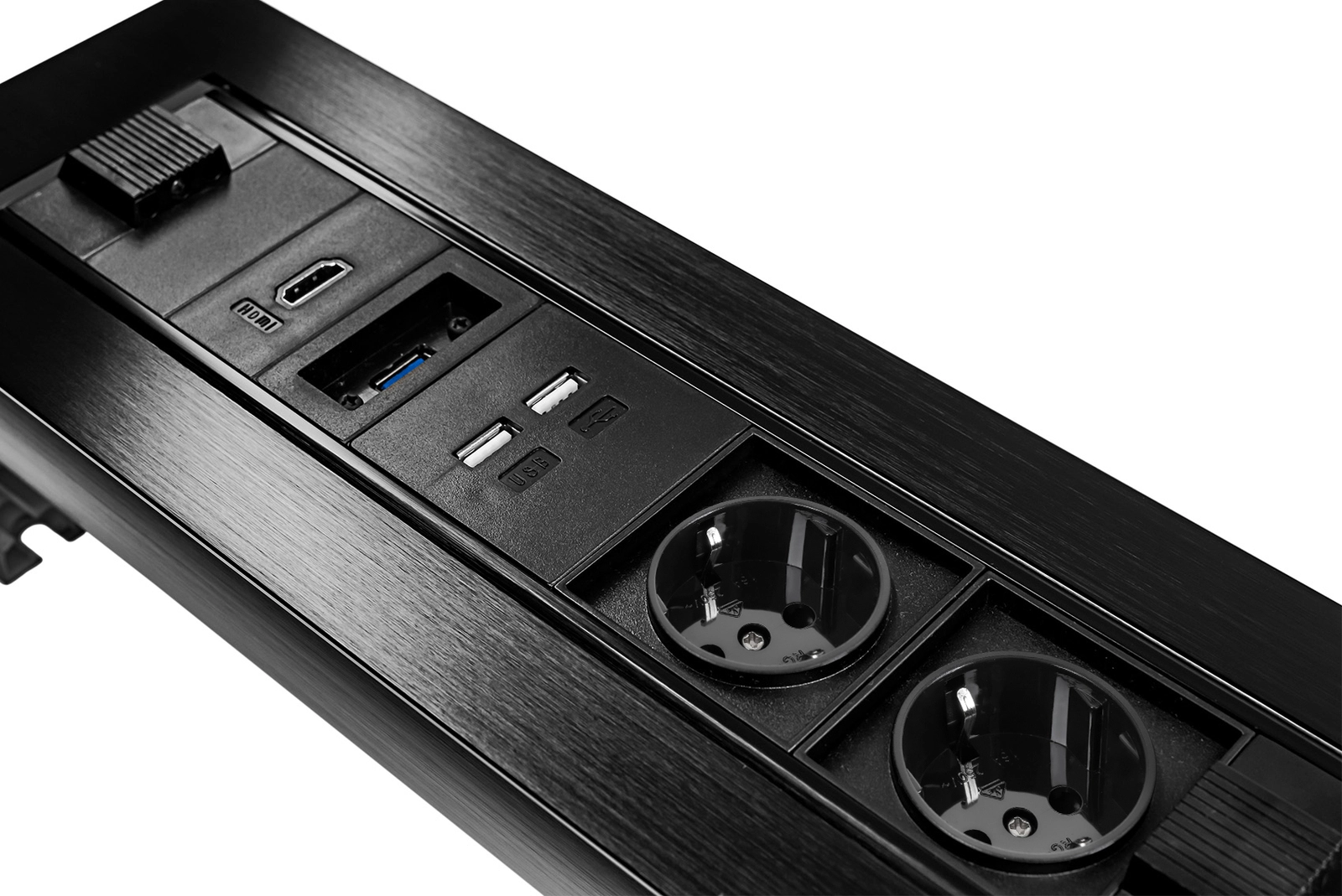 • Elektrischer Dreh-Mediaport für die Installation auf der Arbeitsplatte. Mit 2 Schuko-Steckdosen, dualem USB-Ladegerät, HDMI 2.0-Anschluss, USB 3.0 und induktivem Ladegerät. 1,5 m Strom-, USB- und HDMI-Kabel. In schwarz.