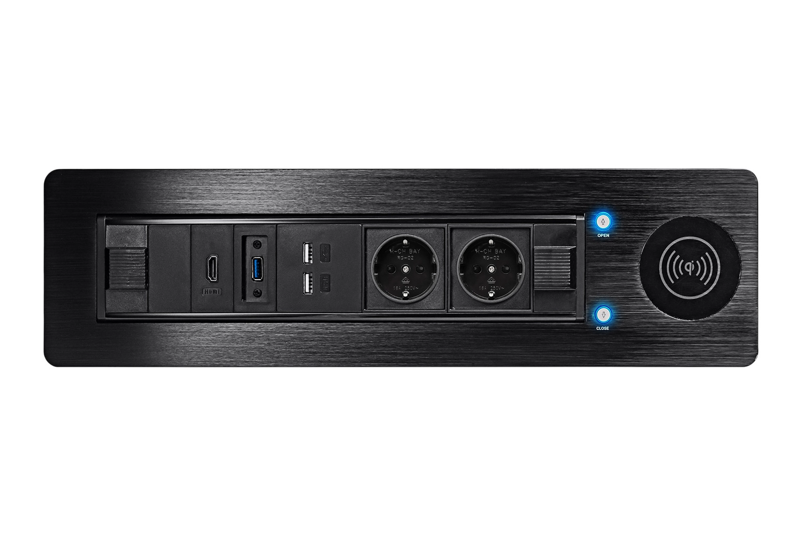 Der elektrische Mediaport SPS-E27B V2 von Spacetronik ist eine hochmoderne Lösung, die in Geschäften, Ausstellungsräumen, Konferenzräumen, Büros und auch zu Hause eingesetzt wird. Mit einem einzigen Knopfdruck decken sich die Steckdosen nahtlos auf. Er ist aus Aluminium und hochwertigen Komponenten gefertigt. Das Produkt ist für die Innenmontage in Schreibtischen, Arbeitsplatten und Tischen konzipiert, entweder vertikal oder horizontal, und bietet Zugang zu Steckdosen. Der Mediaport ist mit 2 Steckdosen 110-250 V (Typ Schuko), einem dualen USB-Ladegerät, HDMI 2.0, USB 3.0 und einem induktiven Ladegerät zum kabellosen Aufladen Ihres mobilen Geräts ausgestattet.