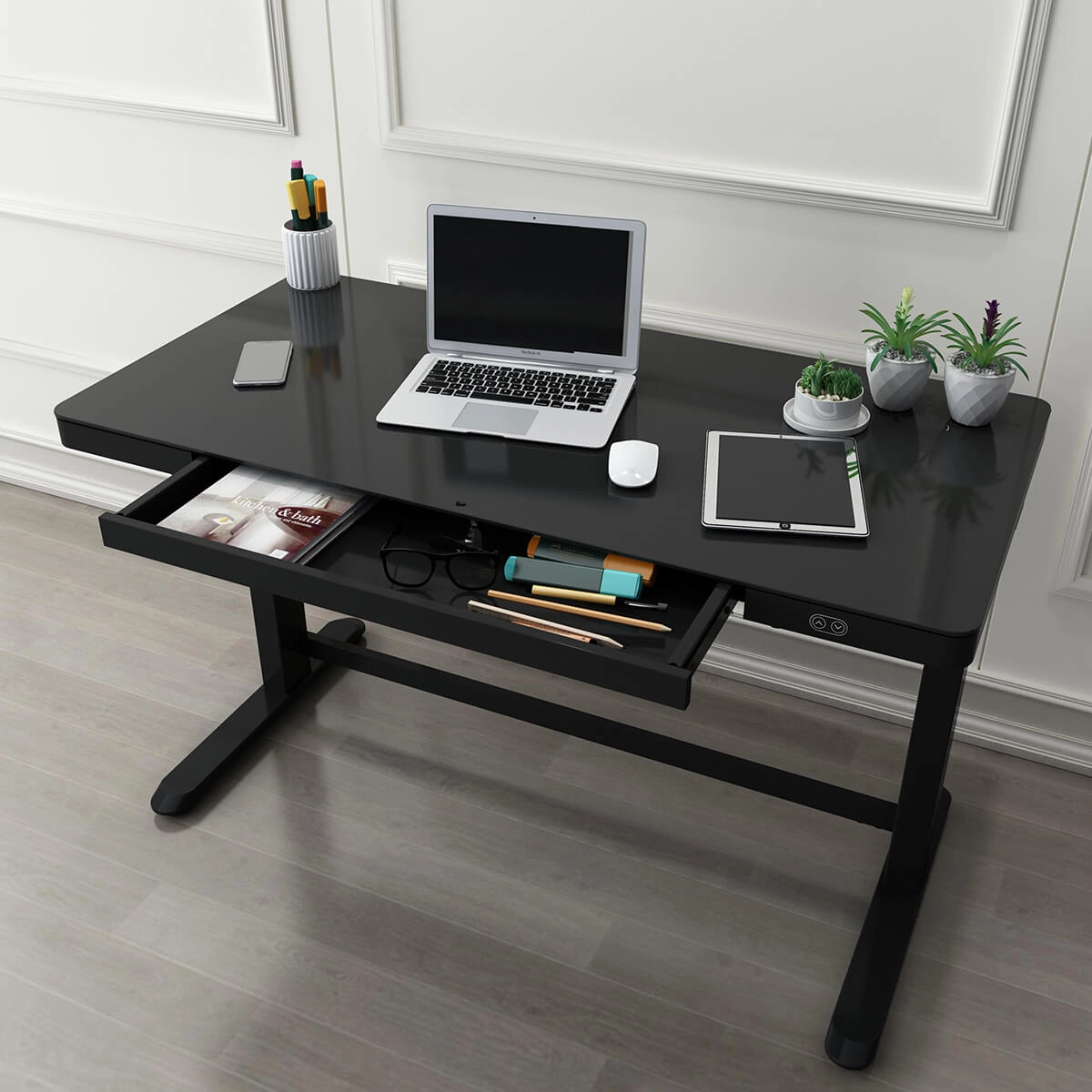 Wir von Spacetronik Ergoline konzentrieren uns auf die Details. Das auf maximale Stabilität ausgelegte Gestell sorgt dafür, dass der Schreibtisch auch in der höchsten Höhe stabil steht. Die dickere und haltbarere Pulverbeschichtung ist kratz-, wasser- und fleckenbeständig. Der Schreibtisch verfügt übereine geräumige Ablageschublade, um Ihren Arbeitsplatz ästhetisch zu gestalten, und diemaximale Tragfähigkeit des Schreibtisches beträgt 50 kg.