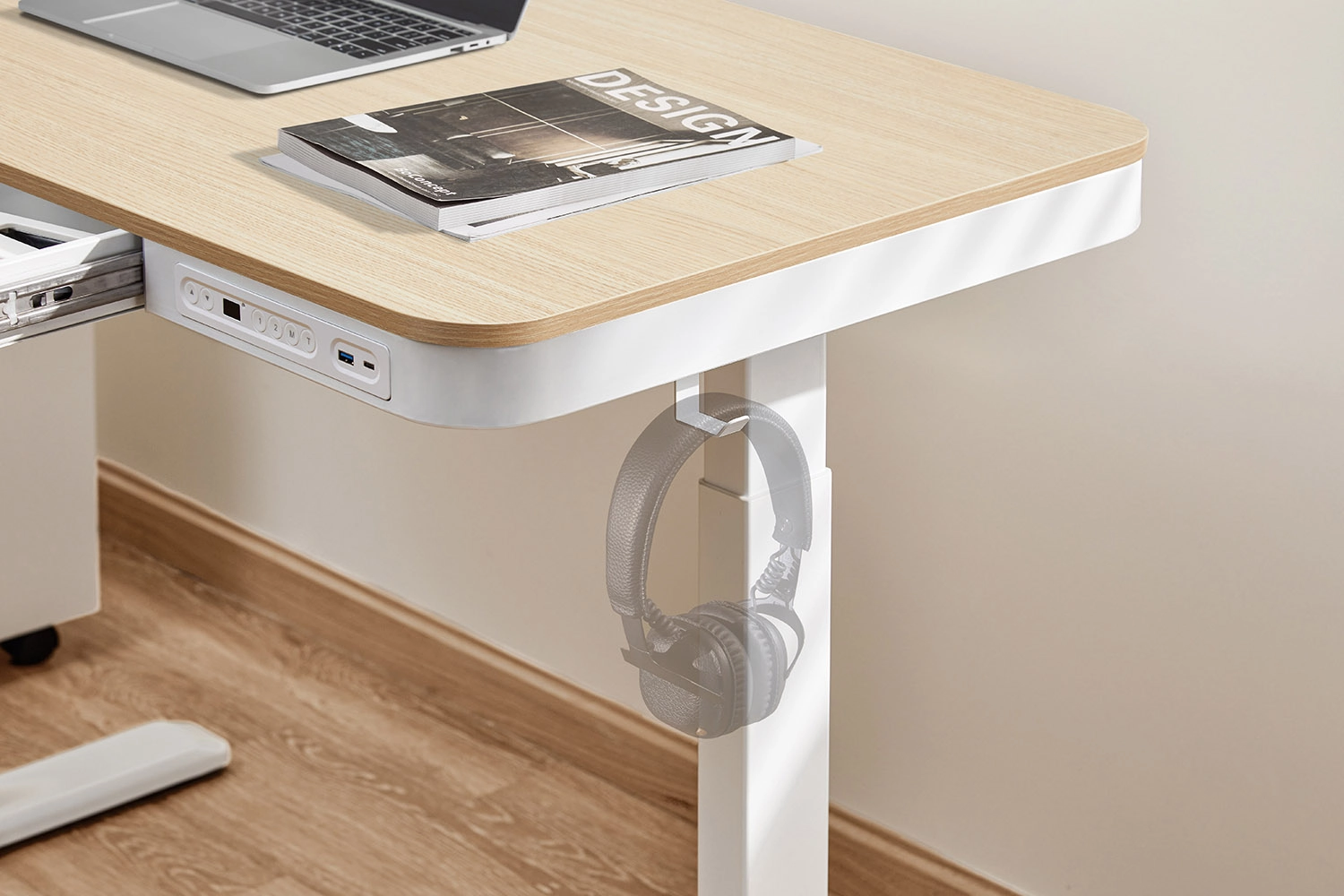 • Elektrische Beine für einen Schreibtisch mit anhebbarer Platte von 72 bis 120 cm, die es Ihnen ermöglicht, im Stehen oder Sitzen zu arbeiten. Top Dekor helles Holz 118 x 60 cm, weißer Rahmen. Inklusive Schublade und USB-A, USB-C-Ladegerät und andere Einri