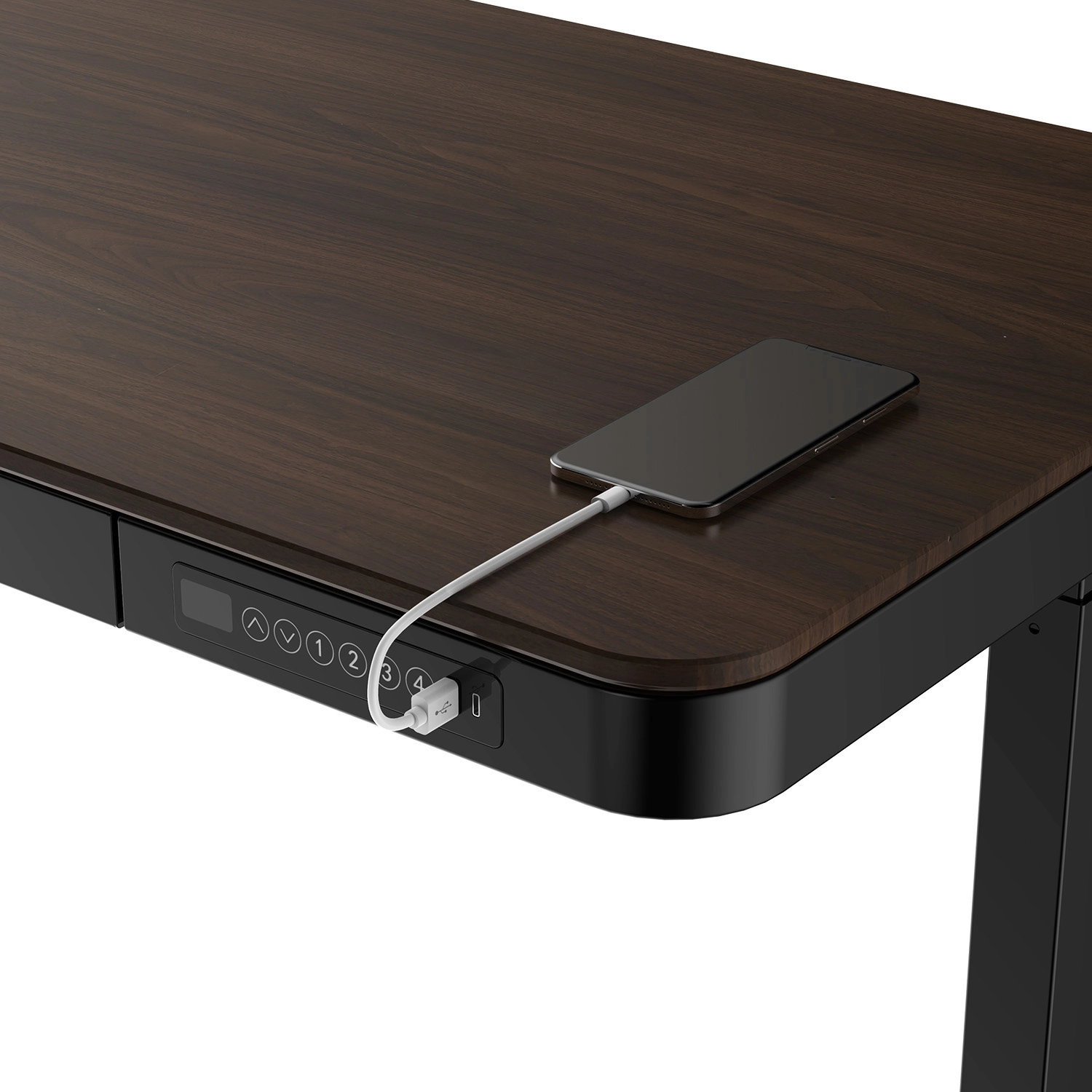 Der Schreibtisch ist mit einem fortschrittlichen Touch-Controller ausgestattet, mit dem Sie Ihre bevorzugten Höheneinstellungen speichern können. Mit einer einzigen Berührung kann der Tisch schnell in die zuvor gespeicherten Positionen gebracht werden, was für zusätzlichen Komfort sorgt. Darüber hinaus verfügt der Controller über einen USB-C-Ausgang und einen USB-A-Ausgang, sodass Sie Ihre mobilen Geräte ganz einfach aufladen können, ohne zusätzliche Ladegeräte zu benötigen. Diese Lösung sorgt für eine aufgeräumte Tischplatte und bietet einfachen Zugang zu einer Stromquelle für alle Geräte, die Sie benötigen.