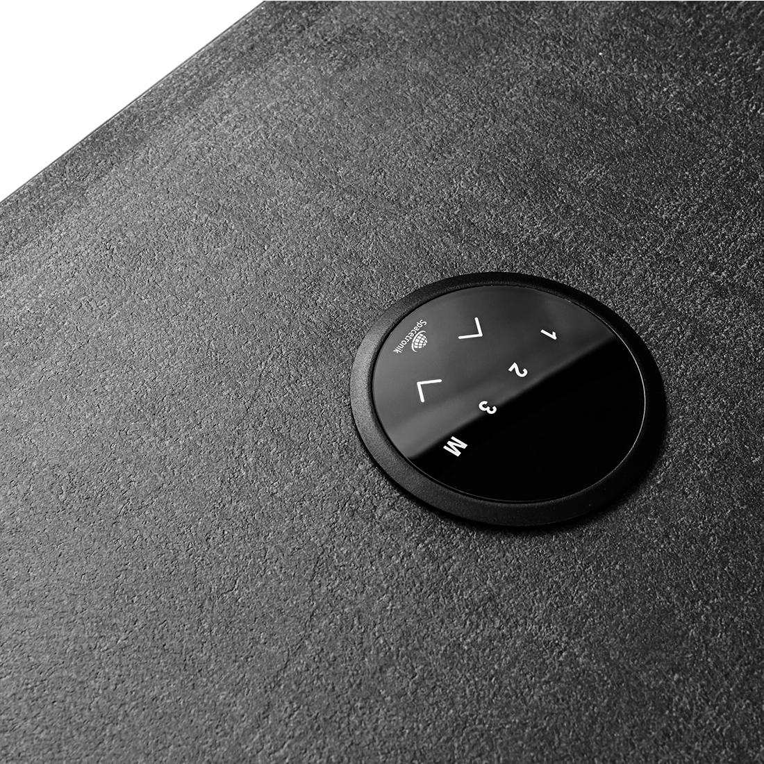 Mit den Auf-/Ab-Tasten können Sie ganz einfach die ideale Höhe der Tischplatte einstellen. Speichern Sie bis zu drei Positionen und kehren Sie zu jeder durch Drücken der entsprechenden Taste zurück. Die Einstellung des elektrisch verstellbaren Gestells von Spacetronik ist äußerst intuitiv.