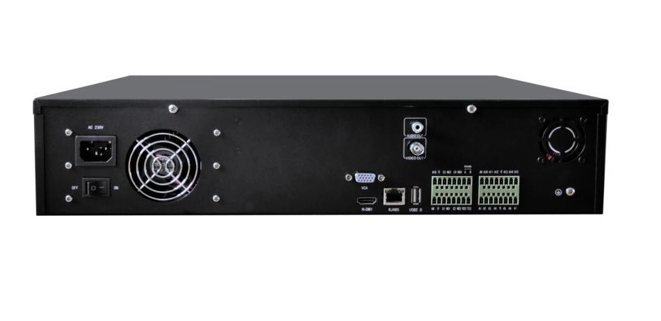 Das Gerät arbeitet in Full-HD-Auflösung und bietet Aufzeichnungen auf allen 24 Kanälen mit einer maximalen Auflösung von 1920x1080 Pixeln. Das Gerät kann mit vier SATA III-Festplatten mit bis zu 16 TB (4 x 4 TB) ausgestattet werden. Das Gerät verfügt über sechzehn Alarmeingänge und vier Ausgänge.