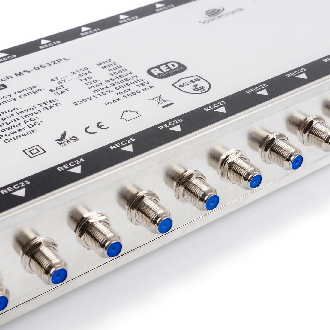 Spacetronik Pro Series 5/32 Multischalter mit 4 SAT-Eingängen + 1 terrestrischen TV-Antenneneingang, ermöglicht die Verteilung von Satellitensignalen an bis zu 32 Endverbraucher. Der Multischalter verfügt über eine eingebaute hochwertige Stromversorgung für einen stabilen Betrieb. Das Gehäuse und die Halterungen sind aus hochwertigen Materialien gefertigt.