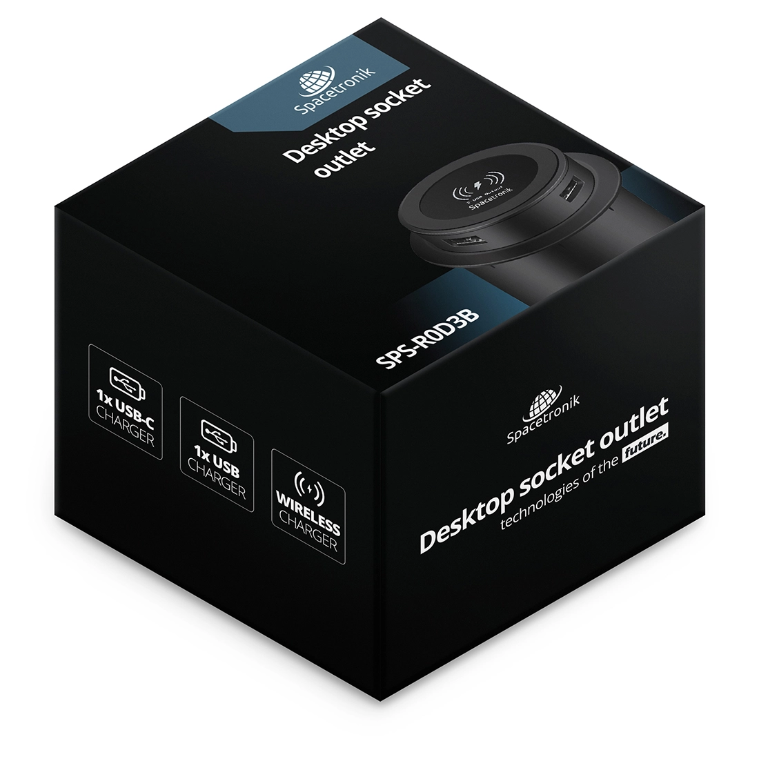 Der Spacetronik mediaport ERGOLINE SPS-R0D3B ist eine moderne Lösung, die in Geschäften, Ausstellungsräumen, Konferenzräumen, Büros und auch zu Hause eingesetzt wird. Er ist aus hochwertigen Komponenten gefertigt. Das Produkt ist für die Inneninstallation in Schreibtischen, Arbeitsplatten und Tischen, sowohl vertikal als auch horizontal, konzipiert und bietet Zugang zu Steckdosen. Dieser runde Mediaport ist mit einem USB-Ladegerät, einem USB-C-Ladegerät und einem induktiven Ladegerät ausgestattet