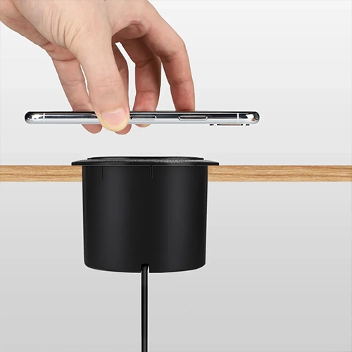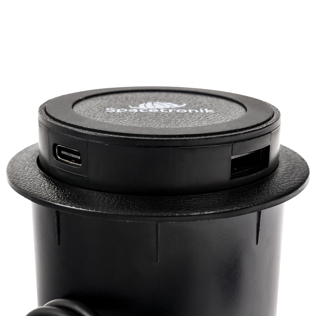 • Eleganter runder Mediaport für die Montage auf der Arbeitsplatte. Er verfügt über 1 USB-Buchse, 1 USB-C-Buchse und ein induktives Ladegerät, um z. B. Ihr Smartphone zu laden. In Schwarz.