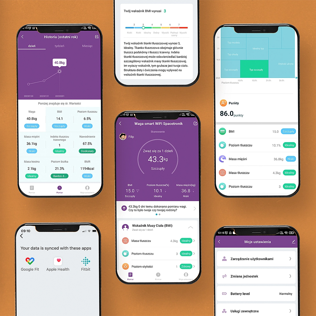 Mit der Möglichkeit, mehrere Körperparameter wie Gewicht, BMI, BMR, BFI, Körperalter, Protein, Knochenmasse, Hydratation, viszerales Fett, Idealgewicht, Adipositasgrad, Fettmasse, Muskelmasse, magere Körpermasse, Körpertyp, Punkte, Gewichtskontrolle zu messen, können Sie Ihre Fortschritte auf dem Weg zu Ihrem Ziel genau verfolgen. Alle Parameter sind auf Polnisch beschrieben.