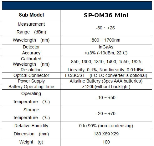 Das optische Mini-Leistungsmessgerät SP-OM36 ist ein eigenständiges Messgerät, das für die Installation, den Betrieb und die Wartung von Glasfasernetzen eingesetzt wird. Das Gerät kann die optische Leistung im Wellenlängenbereich von 800 ~ 1700 nm messen. Sechs kalibrierte Wellenlängen sind in den Einstellungen des Geräts gespeichert: 850 nm, 1300 nm, 1310 nm, 1490 nm, 1550 nm, 1625 nm.