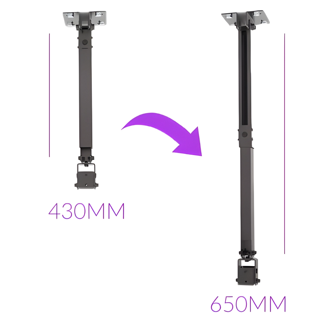 DieProjektorhalterung SPA-P01B lässt sich individuell anpassen, so dass sie sich nahtlos in Ihren Raum einfügt. Die Neigung der Halterung kann zwischen +15~15 Grad eingestellt werden, und darüber hinaus kann die Aufhängung zwischen +8 und -8 Grad gedreht werden. Darüber hinaus ist die Projektorhalterung höhenverstellbar (430-650 mm) und kann sowohl an der Wand als auch an der Decke befestigt werden. Die Aufhängung selbst ist mit einer Kabelführung ausgestattet, die Ihnen hilft, Ihr Gerät ordentlich zu verstauen. All diese Eigenschaften machen die Projektorhalterung SPA-P01B sehr vielseitig und leicht an verschiedene Räume anpassbar.
