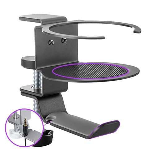 Der Kopfhörer- und BecherhalterSPB-020B sorgt nicht nur für mehr Ordnung im Raum, sondern verringert auch das Risiko von unerwarteten Unfällen. Das Design des Becherhalters und die rutschfeste Oberfläche machen es sehr schwer, ein Getränk zu verschütten, und fast unmöglich, dies aus Versehen zu tun. Das Silikonpolster auf dem Kopfhörerhalter wiederum sorgt dafür, dass die Kopfhörer nicht auf der Oberfläche des Halters verrutschen, und das gebogene Ende schützt sie vor dem Herunterfallen. Außerdem ist der Kopfhörerhalter mit einer Kabelführung ausgestattet, die das Risiko verringert, dass Ihr Stuhl darüber fährt und Ihr Headset dadurch beschädigt wird.