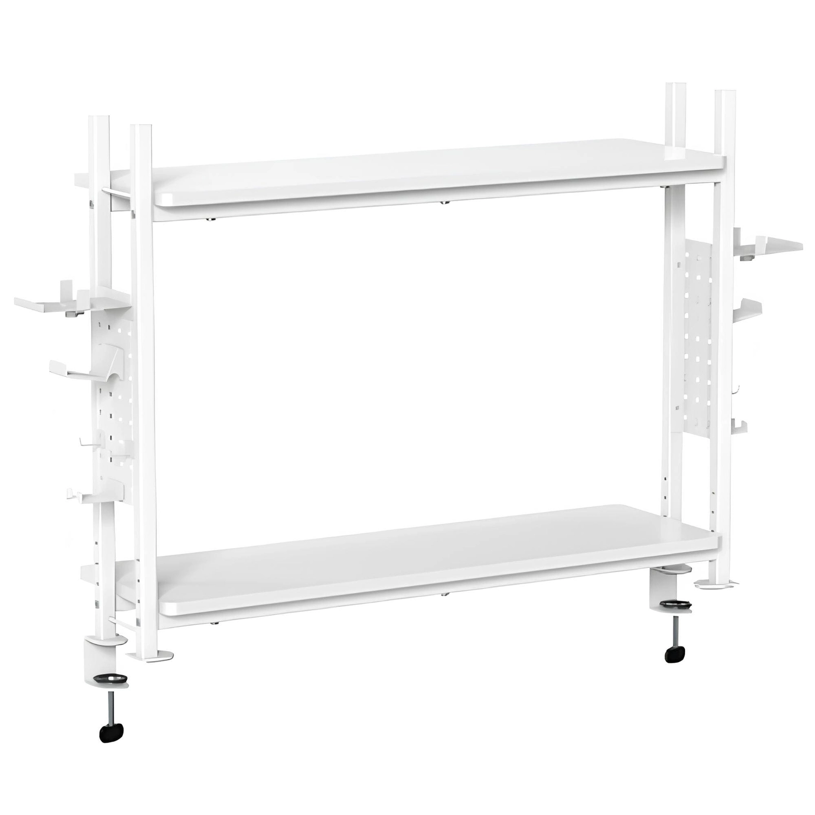 Die Spacetronik SPB-120WW_120 Schreibtischverlängerung ist mit 2 geräumigen Fachböden ausgestattet. Jeder von ihnen bietet eine Tragfähigkeit von 15 kg. Somit können Sie alle Ihre wichtigsten Gegenstände problemlos darauf verstauen. Dabei spielt es keine Rolle, ob es sich um Spieleboxen, Bücher oder Dokumente handelt. Außerdem wurden die Seiten der Erweiterung geschickt genutzt. Anstelle von freiem Platz wurden auf beiden Seiten kleine Lochplatten mit zusätzlichem Zubehör angebracht, wie z.B.: