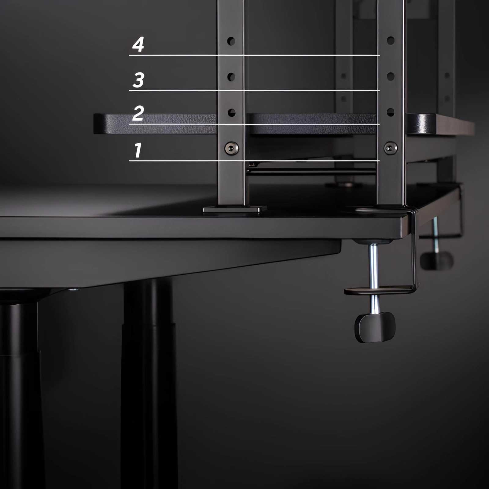 Die Klemmbügel, mit denen Sie die Regalböden an Ihrem Schreibtisch befestigen, müssen nicht gebohrt werden. Sie müssen nur entsprechend der Dicke des Tisches festgezogen werden. Der Mechanismus, der für die Einstellung der Klammern zuständig ist, befindet sich unter der Tischplatte. Er ist in keiner Weise auffällig.