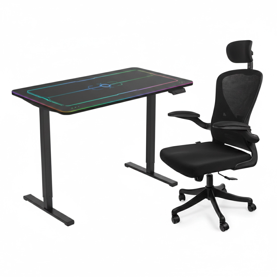 Elementy zestawu:blat gamingowy / stelaż elektryczny / fotel ARON Black