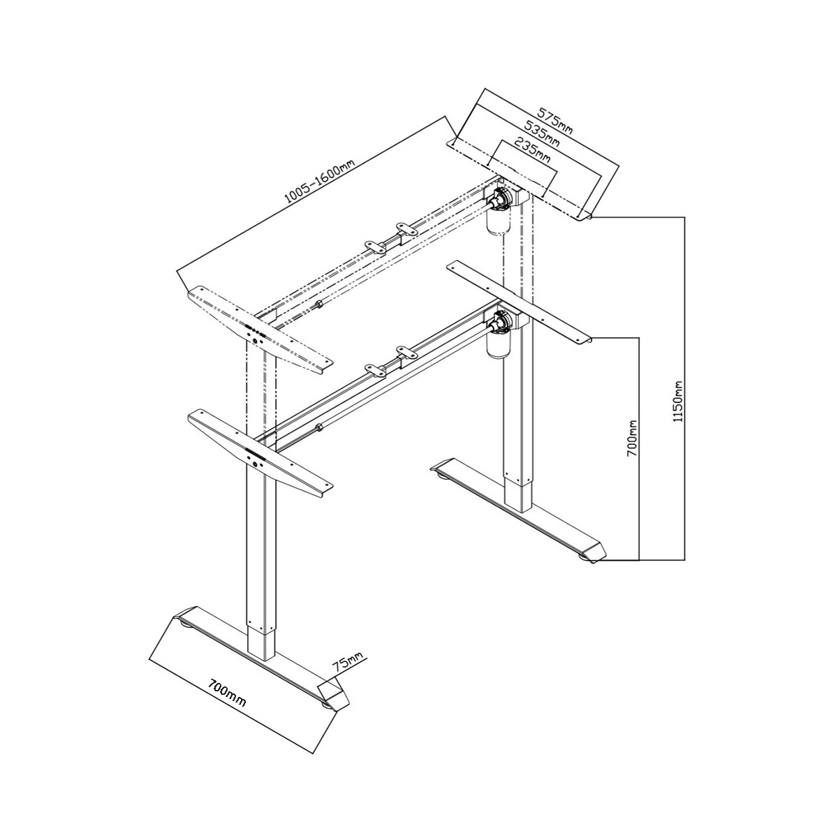 Das vielseitige Gestell des elektrischen Gestells ermöglicht nicht nur die Verstellung nach oben und unten, sondern auch die manuelle horizontale Verstellung (von Seite zu Seite). Sie können die Struktur ganz einfach erweitern, um sie an die Größe Ihrer Tischplatte anzupassen. Empfohlene Abmessungen der Tischplatte: 1200-2000 mm (Breite), 600-800 mm (Tiefe).