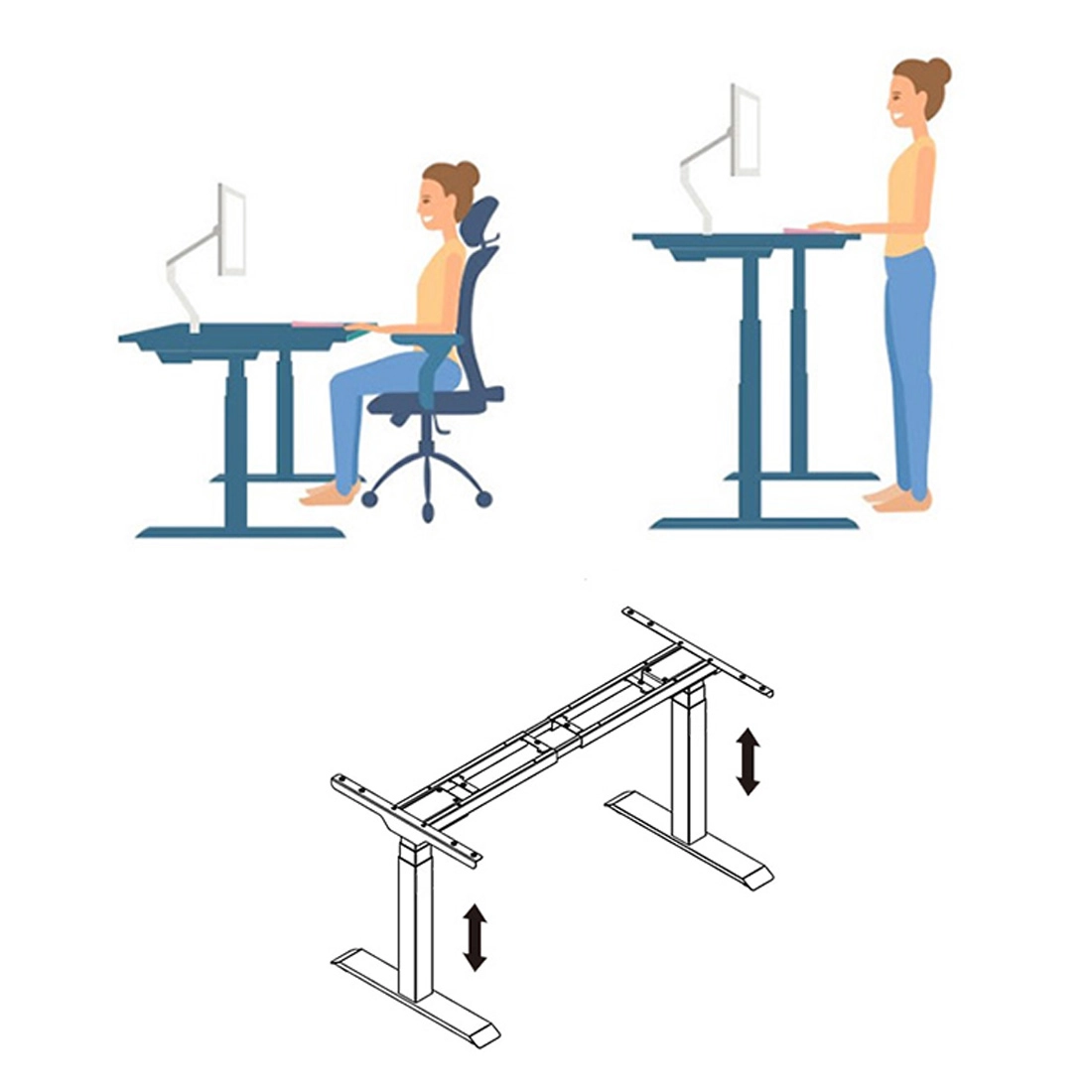 Elektrische Gestelle sind häufig mit einer Höhenverstellung ausgestattet. Der vielseitige Rahmen eines elektrischen Gestells ermöglicht jedoch neben der Höhenverstellung auch eine manuelle Horizontalverstellung (von Seite zu Seite). Sie können das Gestell problemlos an die Größe Ihrer Schreibtischplatte anpassen. Empfohlene Tischabmessungen: 1200-2000 mm (Breite), 600-800 mm (Tiefe). Gestalten Sie Ihren Traumarbeitsplatz noch heute!